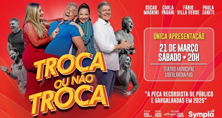 A comédia “Troca ou Não Troca”, estrelada por Oscar Magrini, desembarca em Uberlândia para apresentação única no dia 21 de março (sábado), às 20h, no Teatro Municipal. Com humor inteligente e ritmo envolvente, o espetáculo promete arrancar gargalhadas do público ao mesmo tempo em que provoca reflexões sobre os desafios dos relacionamentos no século XXI.